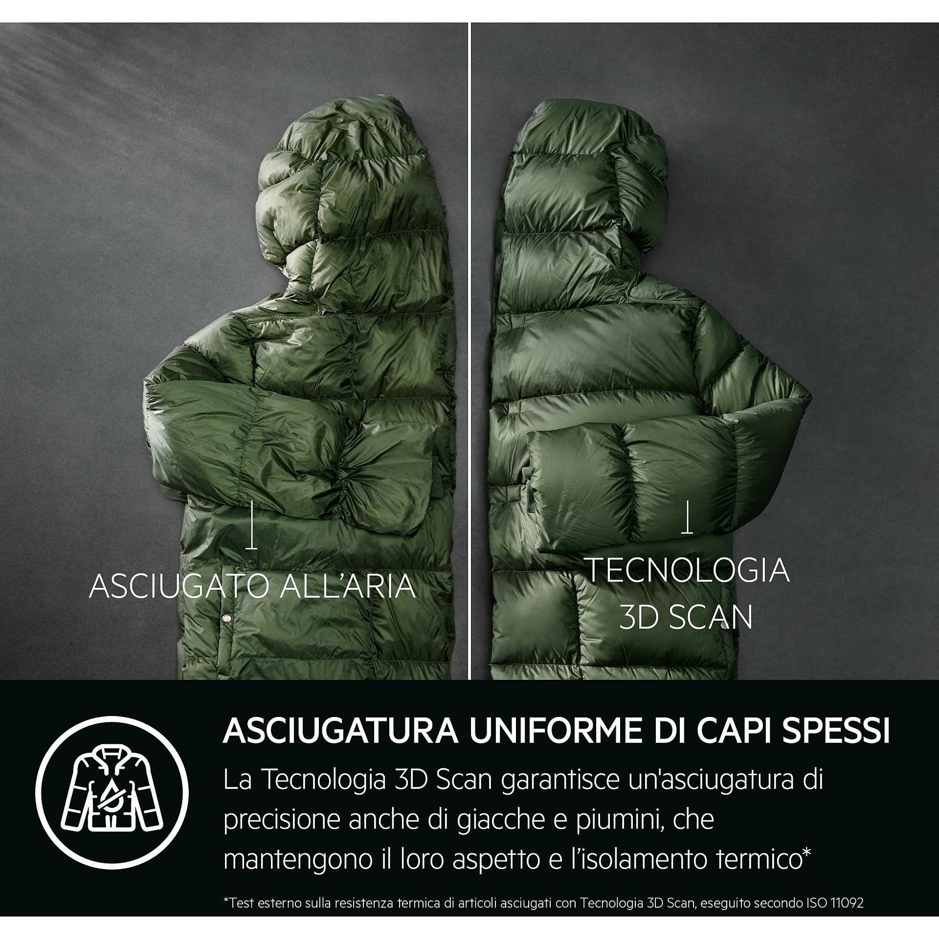 La tecnologia 3D Scan rappresenta un vero e proprio salto di qualità nell'asciugatura dei capi voluminosi, come piumini e giacche imbottite. A differenza dei sensori tradizionali, che rilevano l'umidità solo sulla superficie dei tessuti, la tecnologia 3D Scan è in grado di penetrare fino a 5 cm di profondità, garantendo un'asciugatura uniforme e completa. Questo significa che i vostri piumini saranno perfettamente asciutti, soffici e voluminosi, senza il rischio di accumuli di umidità o di perdita di isolamento termico. La tecnologia 3D Scan è particolarmente indicata per chi possiede capi delicati e voluminosi, che richiedono una cura speciale e un'asciugatura precisa. Con l'AEG Asciugatrice Serie 9000X, potrete dire addio ai piumini appiattiti e alle giacche umide, godendo di capi sempre perfetti e pronti all'uso. Immaginate di poter asciugare i vostri piumini preferiti senza il timore di rovinarli o di comprometterne le proprietà isolanti. Grazie alla tecnologia 3D Scan, l'asciugatrice AEG è in grado di rilevare l'umidità residua all'interno dei capi, regolando automaticamente i parametri di asciugatura per garantire un risultato impeccabile. Questa funzione è ideale per chi cerca una soluzione efficace e delicata per la cura dei capi voluminosi, senza dover rinunciare alla performance e alla qualità. Scegliete l'AEG Asciugatrice Serie 9000X e scoprite come la tecnologia 3D Scan può trasformare la vostra esperienza di asciugatura, offrendovi risultati superiori e una cura delicata per i vostri tessuti preferiti.