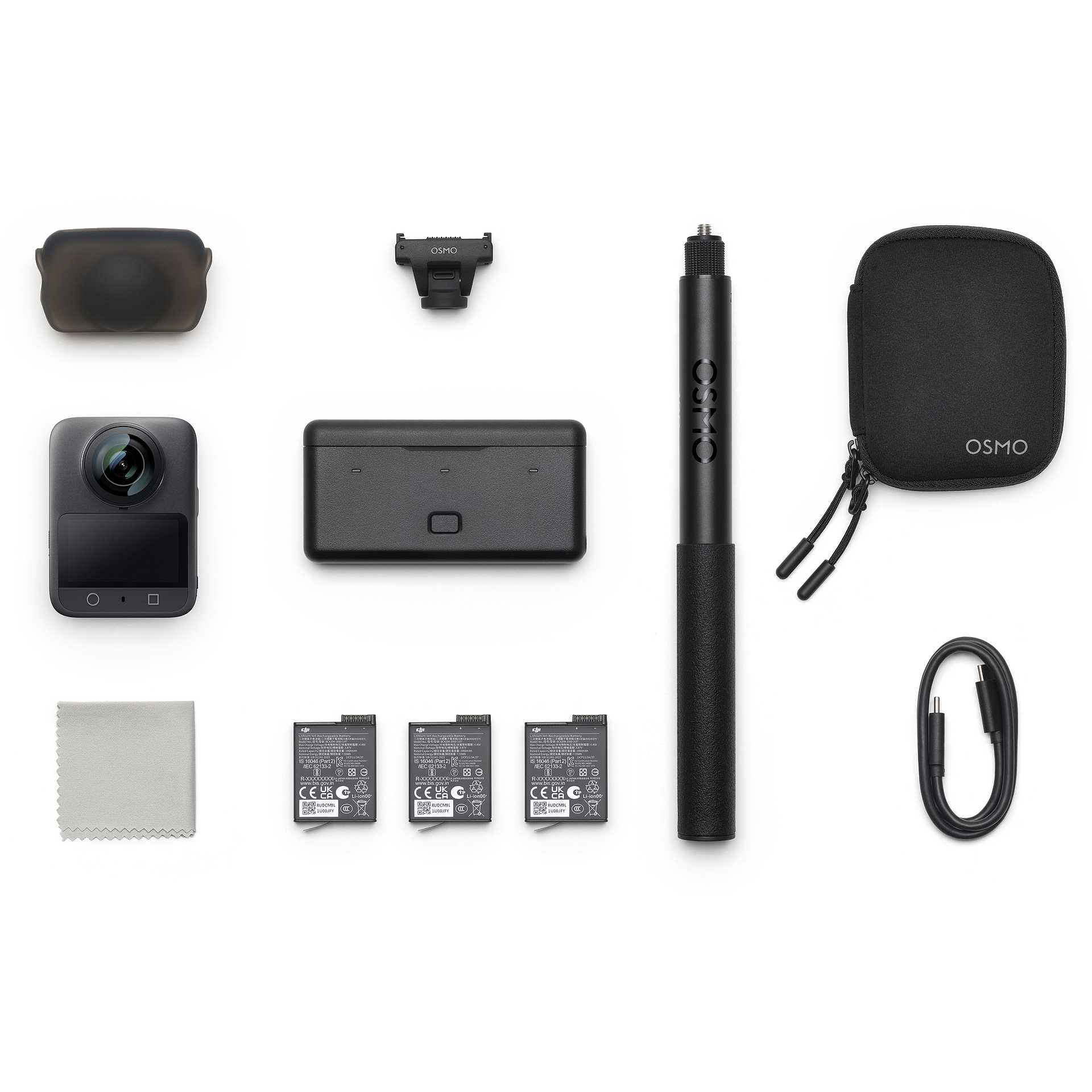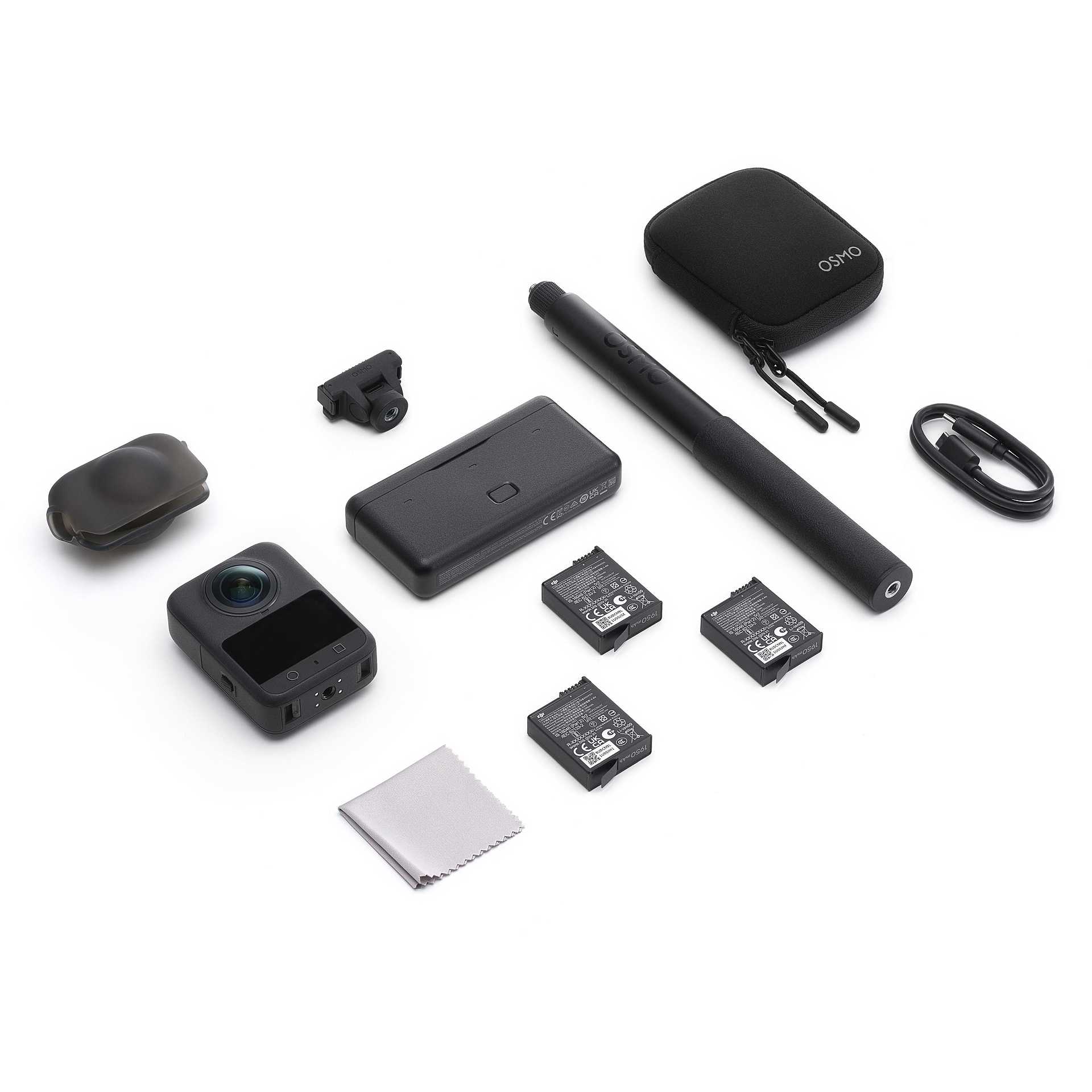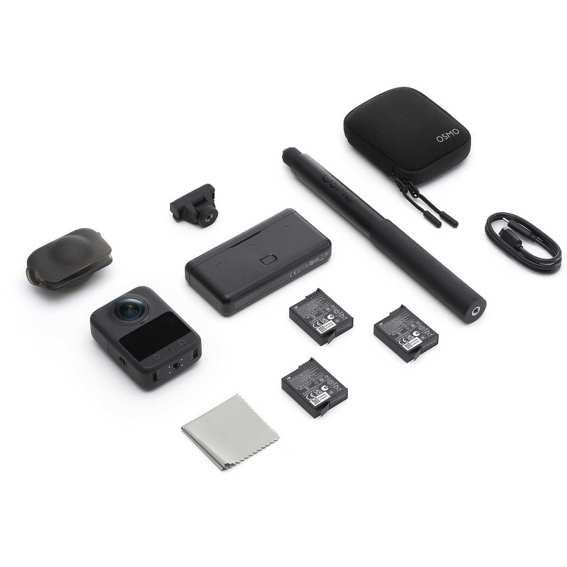 Contenuto della confezione | 3 x Osmo Action Extreme Battery Plus (1950 mAh) Osmo Action Multifunctional Battery Case 2 Osmo 360 Camera Protective Pouch Osmo Lens Cleaning Cloth DJI Logo Sticker Disclaimer |
