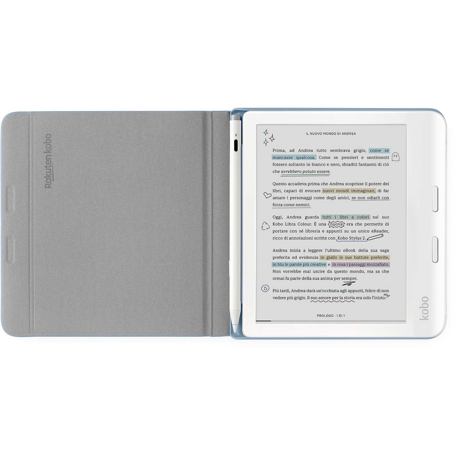 - SCRIVI E RIPONI IL TUO KOBO STYLUS 2 – Il design sottile della Custodia per Kobo Libra Colour e Stylus consente di scrivere comodamente con la Kobo Stylus 2* (venduta separatamente) e di riporla nell'apposito alloggio magnetico integrato.