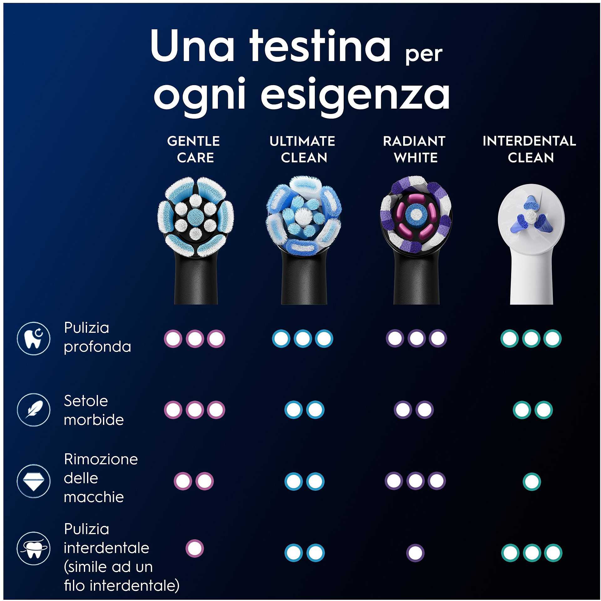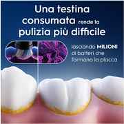 - Setole che cambiano colore: le testine di ricambio oral-b sono dotate di setole che cambiano colore per segnalare quando sostituire la testina per ripristinare una pulizia efficace al 100%