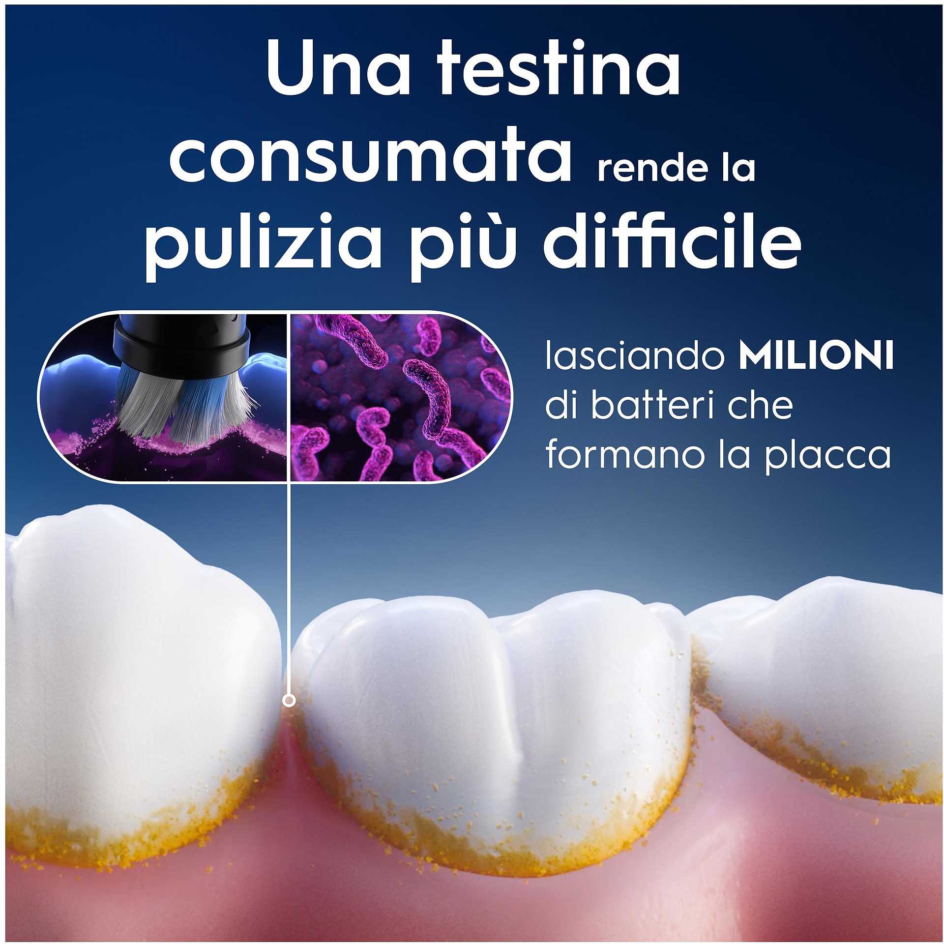 - Sostituire ogni 3 mesi: una testina per spazzolino consumata rende la pulizia difficile non aiutando a raggiungere la placca batterica tra i denti. Per una pulizia superiore, sostituisci la testina quando le setole si consumano