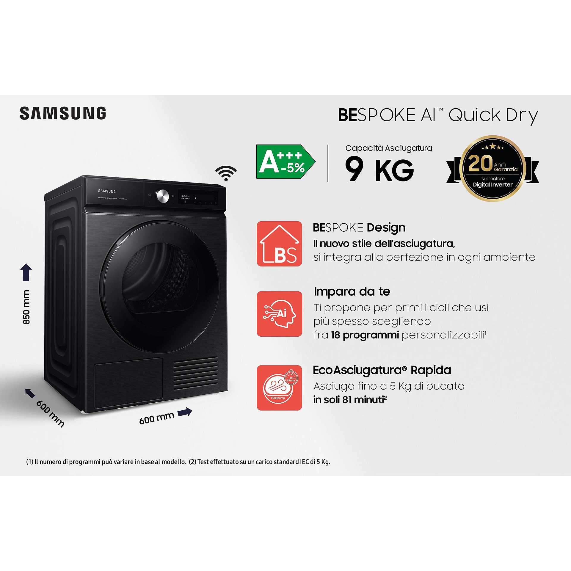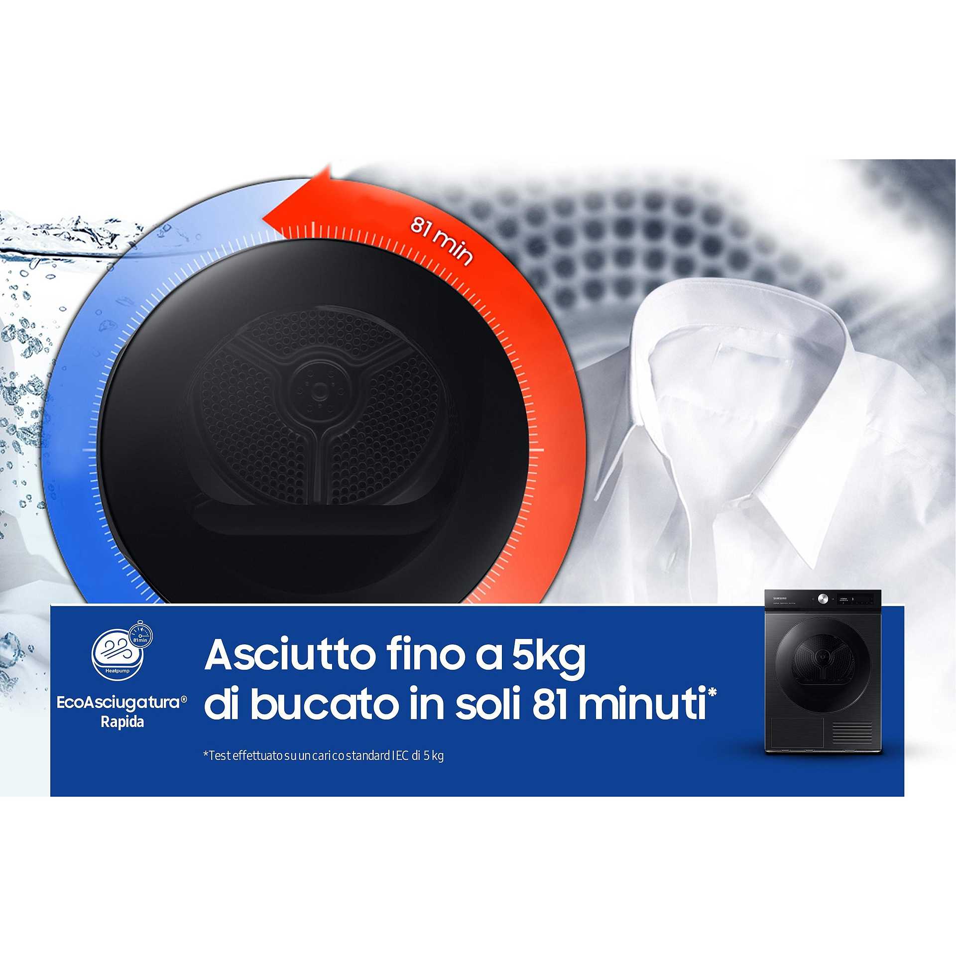 Ti servono vestiti asciutti e pronti da indossare in sole 2 ore, ma vuoi evitare di eccedere nei consumi? Abbina il programma Ecoasciugatura Rapida (che asciuga 5 Kg di carico misto cotone e tessuti sintetici in soli 81 minuti[9] ) al programma Ecolavaggio Rapido delle lavatrici BESPOKE AI™, che lava e centrifuga in 39 minuti[9]. Capi puliti e asciutti in sole 2 ore!