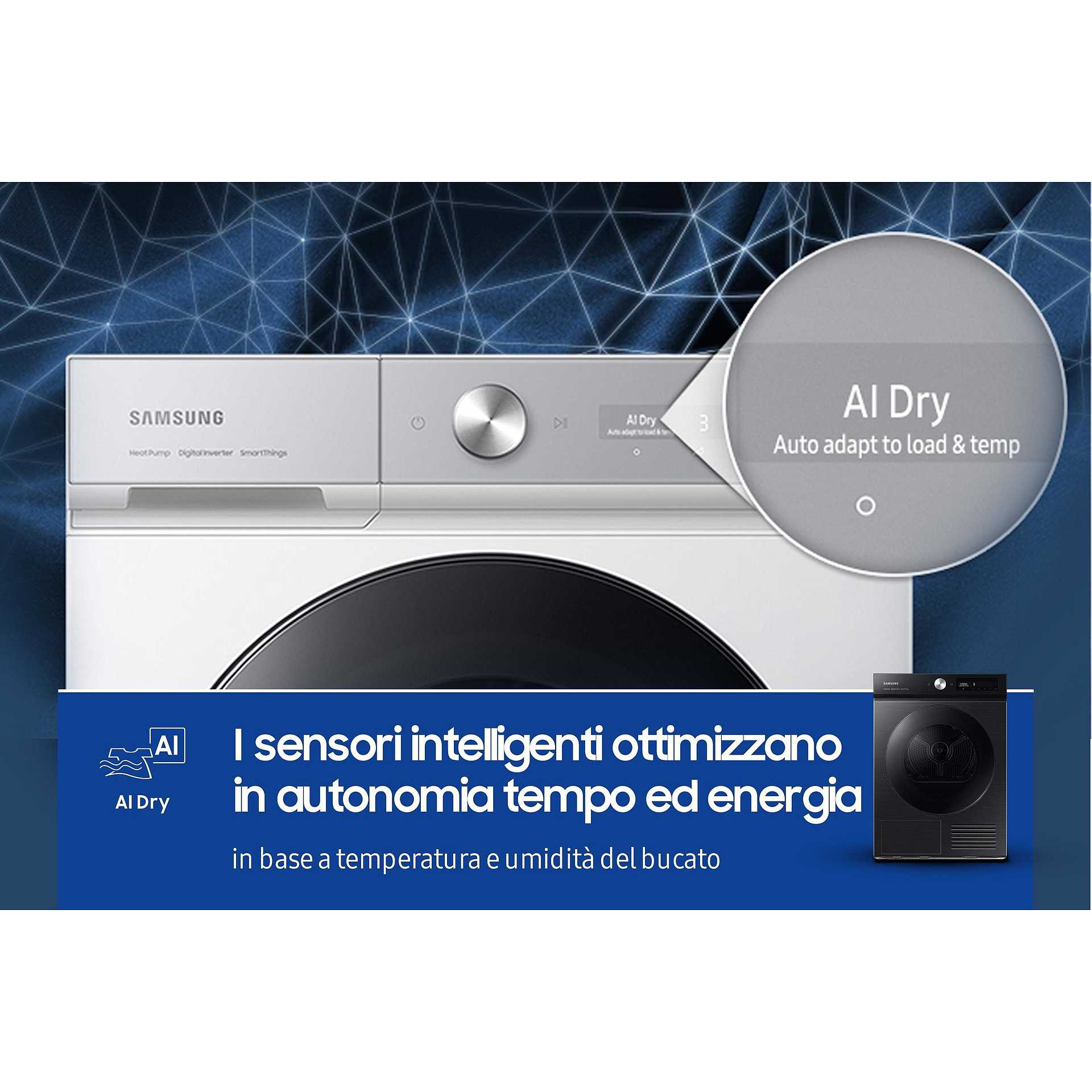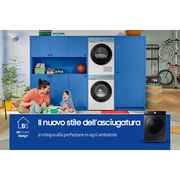 Con AI Control l'asciugatrice è dotata di intelligenza artificiale che impara dalle tue abitudini, si adatta alle tue preferenze e ti propone subito i programmi e le opzioni che usi più frequentemente. Inoltre con l'app SmartThings[7] , l'asciugatrice comunica con la lavatrice impostando direttamente il programma di asciugatura ideale in base al ciclo di lavaggio[8] appena concluso.
