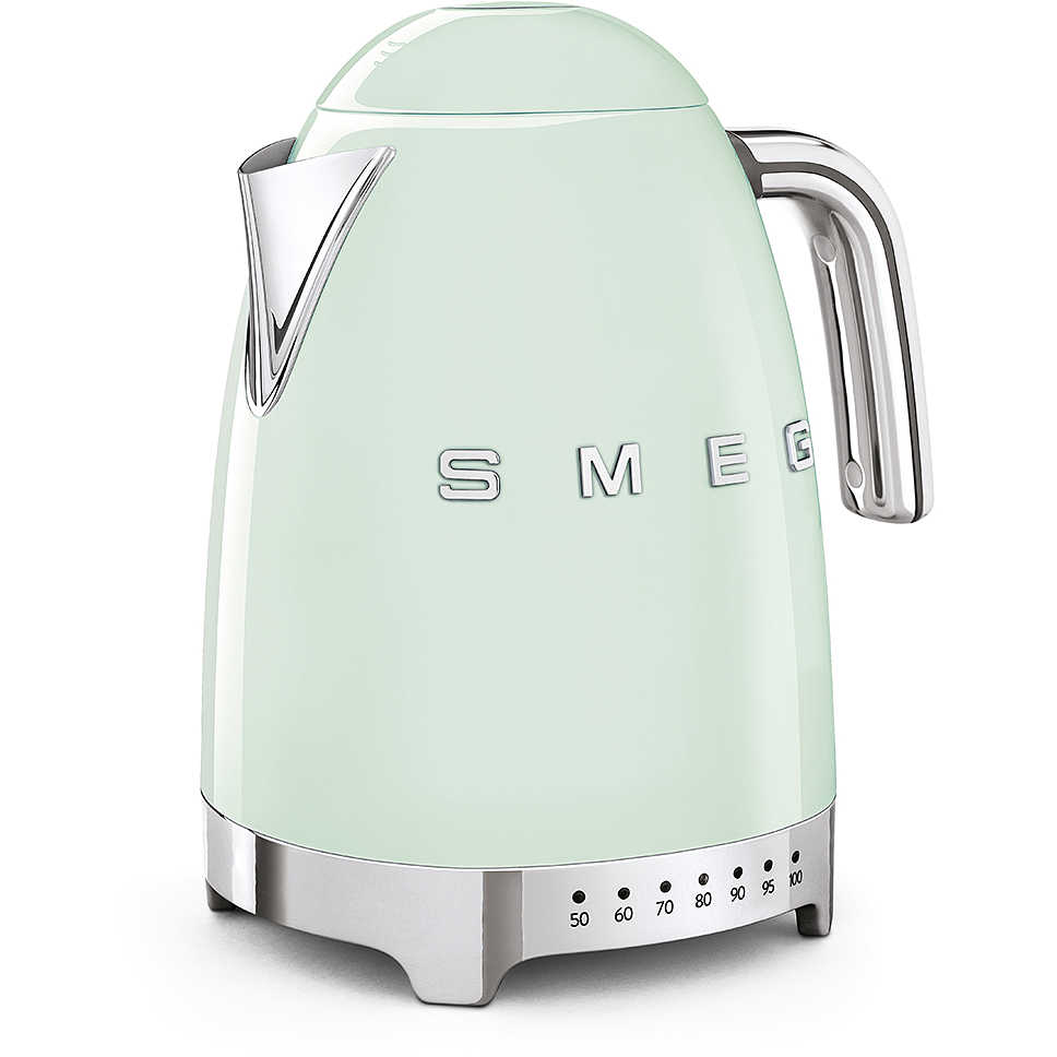 Smeg KLF04PGEU è un bollitore elettrico dotato di un corpo in acciaio inox verniciato di colore verde pastello, una base cromata lucida e una maniglia cromata. Anche il pomello di leva per la selezione della temperatura è in acciaio inox.