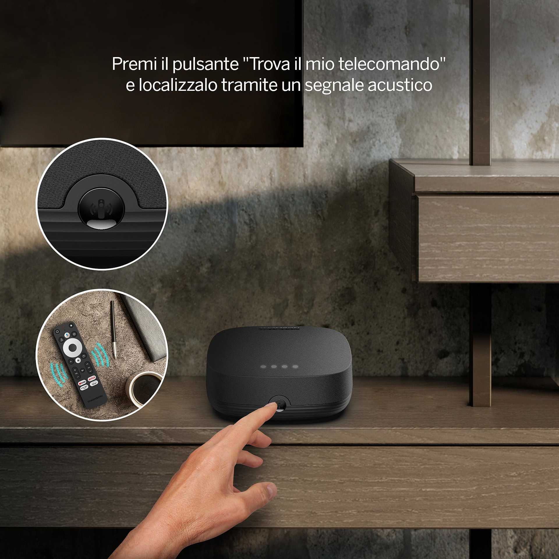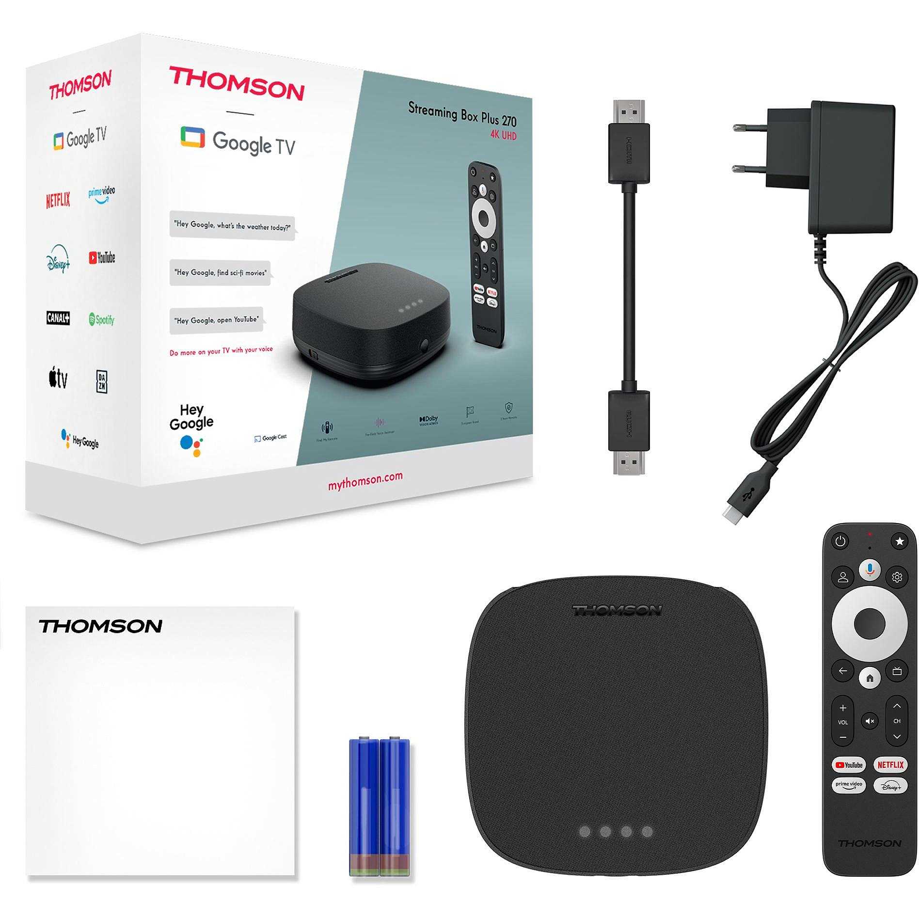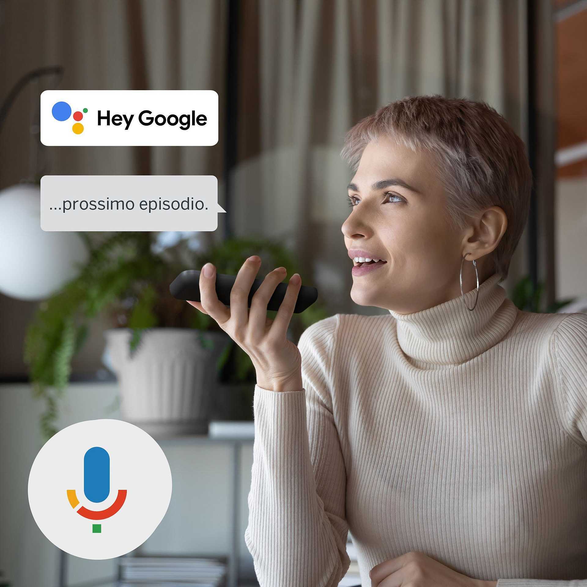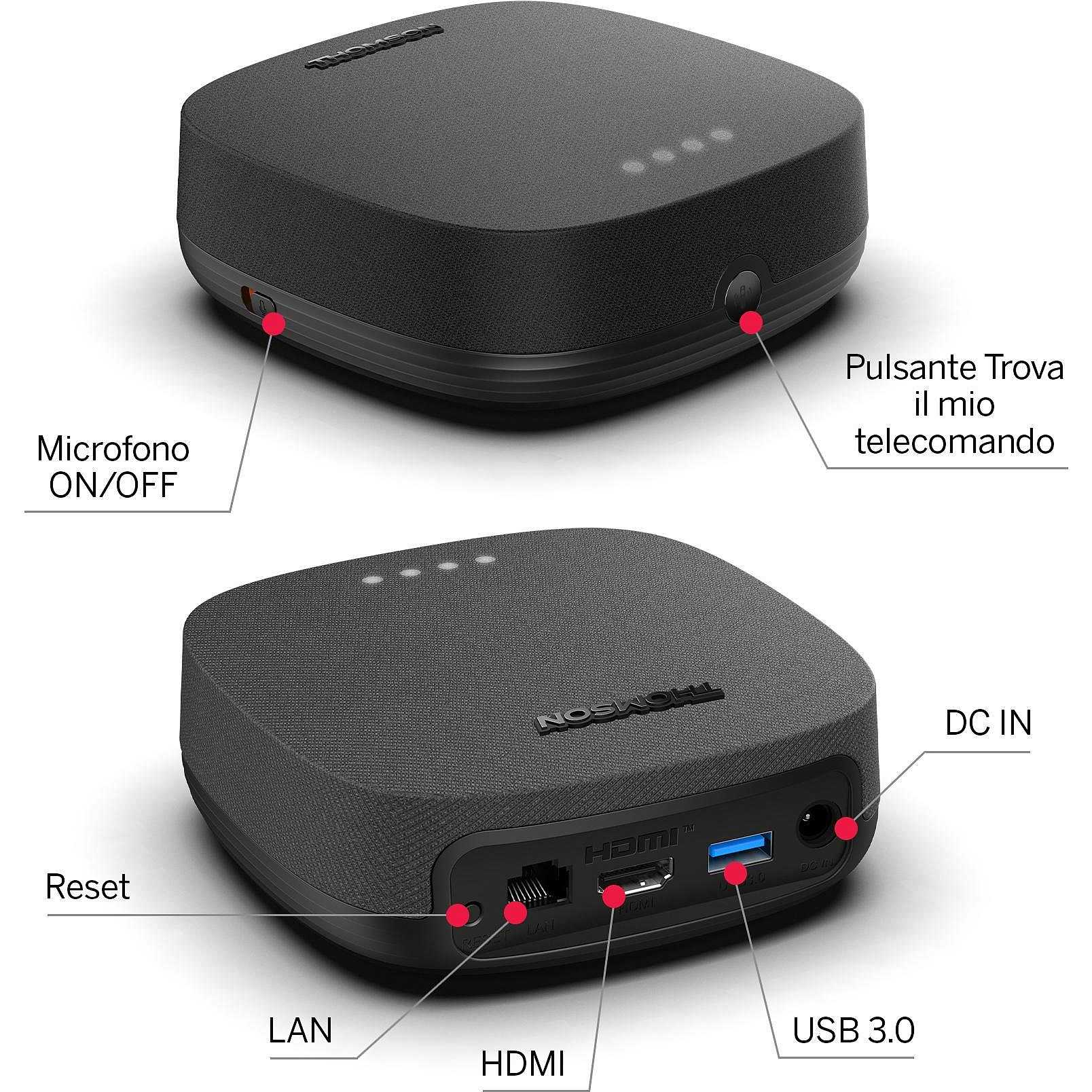 La THOMSON Streaming Box Plus offre anche aggiornamenti pensati come l’assistente vocale a lungo raggio o la funzione "Trova il mio telecomando". Parla al tuo dispositivo da qualsiasi punto della stanza e controlla la TV senza utilizzare le mani. I microfoni integrati, certificati per Google Assistant, offrono la comodità del controllo vocale. Il dispositivo ha anche un altoparlante integrato, pronto a rispondere alle tue domande e richieste.