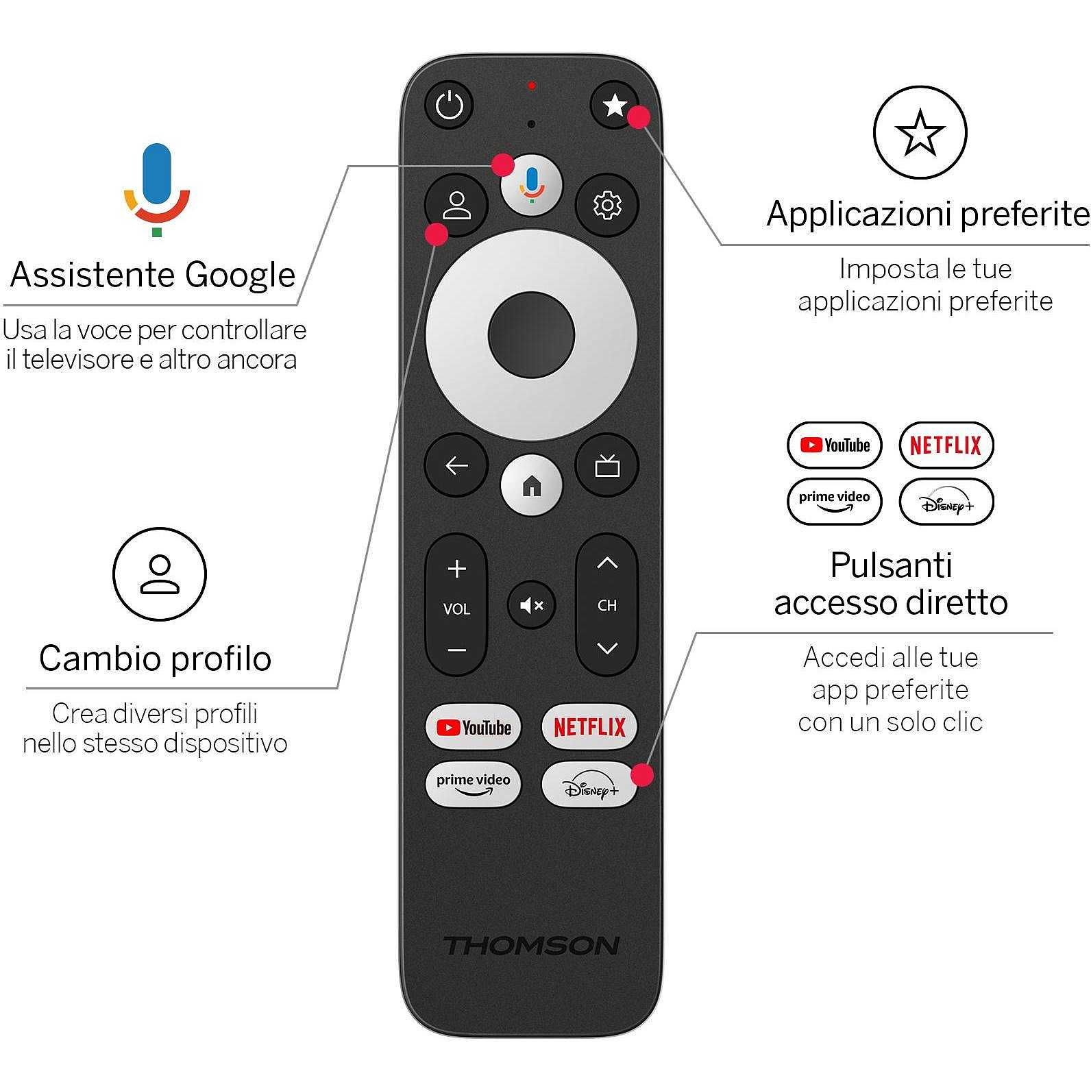 Il telecomando ergonomico consente un rapido accesso alle tue app preferite tramite il pulsante “Stella” personalizzabile o i tasti dedicati per Netflix, Disney+, YouTube e Prime Video.